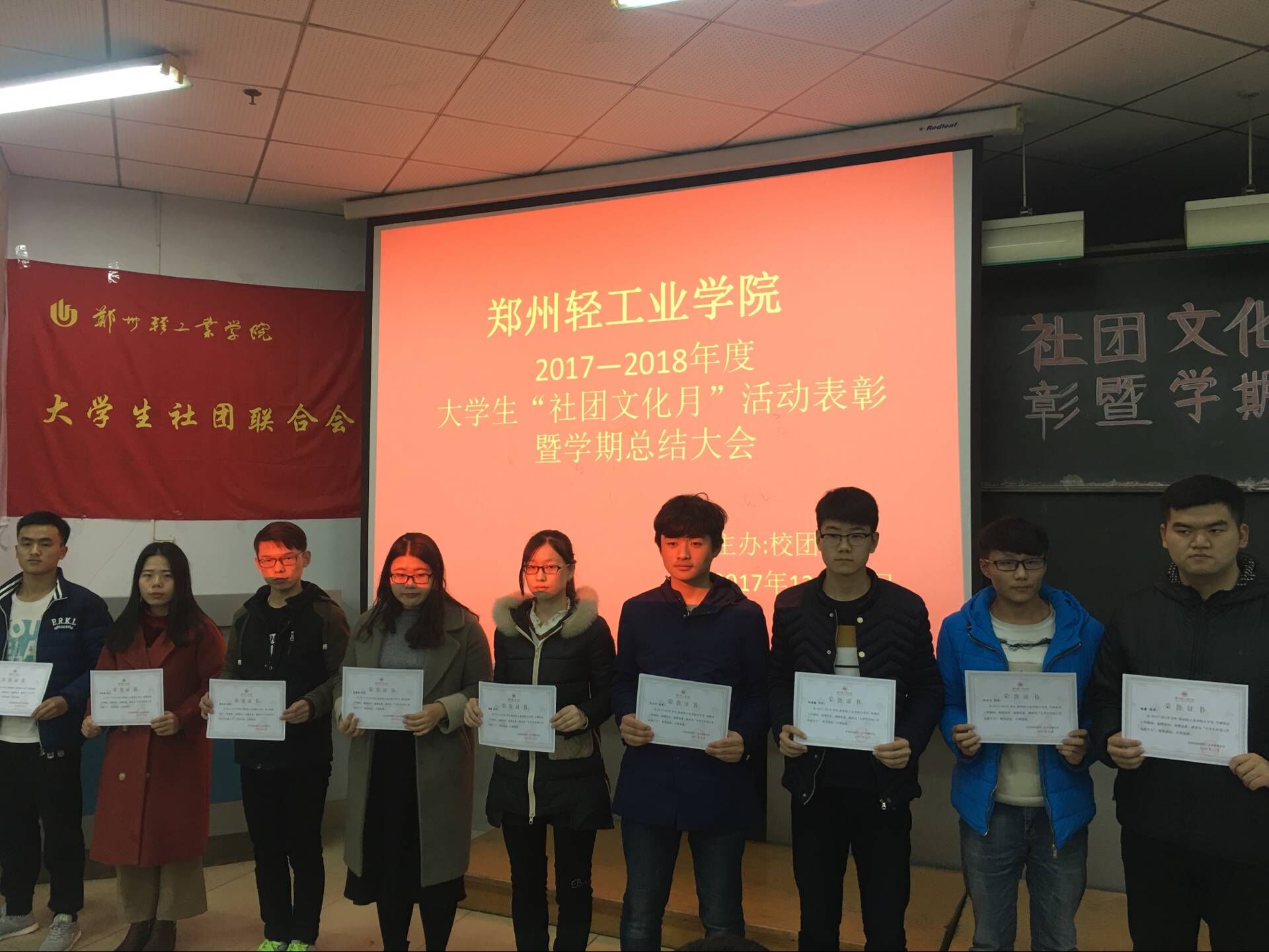 在过去的一学期中,大学生社团联合会在校党委的正确领导和校团委的具体指导下,引导、服务、管理、监督东风校区31个学生社团开展工作,一直本着“自我服务、自我管理、自我教育、自我监督”的理念,按照“一心双环”团学组织格局,致力于我校的学生社团发展和校园文化建设。为把我校社团打造成轻院特色品牌而不懈奋斗。 为进一步促进学生社团“规模化、精品化、特色化”建设,促进学生社团健康发展、举办更多有意义的精品活动。12月28日下午,由大学生社团联合会举办的“2017-2018学年上学期社团潮表彰暨总结大会”在东风校区教三102教室举行。出席本次会议的嘉宾有:校团委副书记景志勇老师、大学生社团联合会主席团。本次大会由大学生社团联合会副秘书长王慧洁主持。 大会第一项,大学生社团联合会书记史晨曦做期末工作总结,她的讲话总结了本学期来各个社团的优秀活动,表达了对下一学年社团发展的美好期许。大会第二项:颁奖环节。主持人宣布奖项设置和评选标准。这次表彰共分为四个奖项:最具影响力奖、最佳组织奖、最佳创意奖、最佳人气奖、最佳合作奖、最具潜力奖、最佳进步奖。评选表准也是根据不同的奖项,设置相对应的标准。大会第三项:对本学期社团社联优秀个人颁发证书,以资鼓励。大会第四项:由四类社团派代表做学期工作总结。大会第五项:校团委副书记景志勇老师上台发表讲话,他提出社团活动应该高标准严要求的去开展,丰富在校学生第二课堂,展现轻院学子风采。各项奖项获奖情况:最具影响力奖:青年志愿者协会、英语沙龙协会、演讲与口才协会;最佳组织奖:营销协会、武术协会、交谊舞协会、轮滑社、计算机爱好者协会;最佳创意奖:武术协会、棋类协会、山水蒙汉服社、读书协会、驼铃文学社、摄影协会、创意手工艺协会、书画协会;最佳人气奖:演讲与口才协会、青年志愿者协会、英语沙龙协会;最佳合作奖:羽毛球协会、绘音社、交谊舞协会;最具潜力奖:电子科技协会、网球协会、乒乓球协会、动漫社;最佳进步奖:创意手工艺协会、健身健美协会、无线电协会、足球协会。 学生社团是当代大学生生活里的重要组成部分,社团活动丰富了广大在校学生的课余生活,扩大了学生的知识面、交际面,提供了更多社会实践的平台,是拓展学生素质的重要载体。因此,多举办一些高质量高水平的社团活动也极为重要,希望通过此次表彰大会,各个协会都可以从其他协会中取其精华,继续发扬自己协会的优点,让各自协会发展地越来越好。