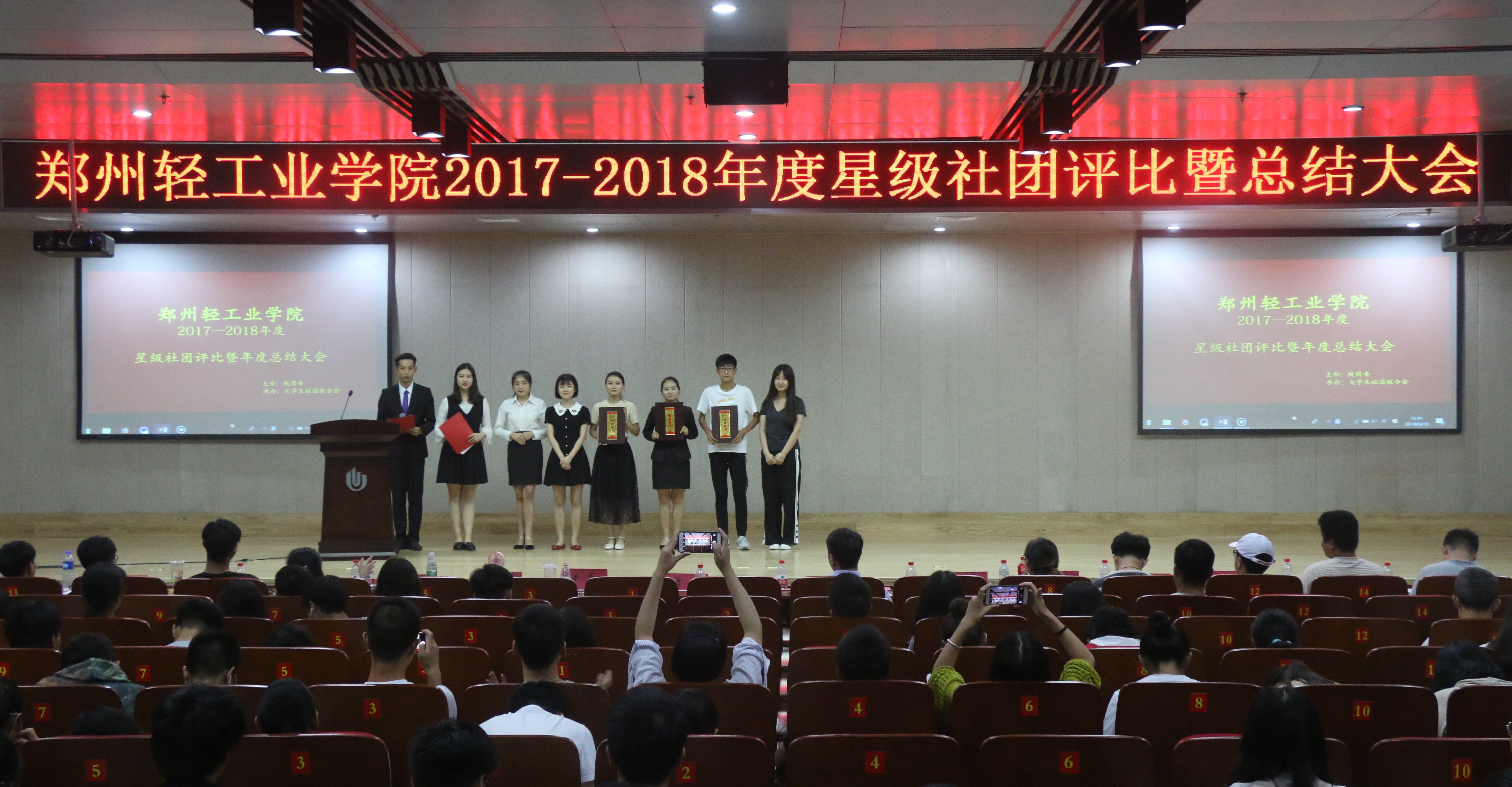 为进一步加强对学生社团的管理,促进社团未来的发展,为各个社团提供一次展现本学年活动成果的机会;同时也为凸显学生社团在校园建设中的作用,6月9及10日,由校团委主办,大学生社团联合会承办的郑州轻工业学院2017-2018学年星级社团评比暨总结大会分别在科学校区逸夫图书馆报告厅和东风校区教三楼100室顺利举行。参与本次活动的嘉宾有:校团委副书记景志勇老师、校团委办公室主任王银峰老师、大学生社团联合会主席范文杰、团工委书记史晨曦、团工委常务副书记袁正、常务副主席陈云、副秘书长叶铭、王慧洁、副主席高国栋、孟磊、左文思、团工委副书记高扬、李丹、张合欢、周宇恒,东风校区办公室主任郑浩、组织部部长朱奕柯以及各社团代表和社联全体成员。 活动伊始,由主持人宣布本次活动正式开始并介绍到场嘉宾。接着活动进入第一项,校团委副书记景志勇上台致辞。他首先对本次大会和近年来我校社团的发展给予了充分肯定和高度的赞扬,同时也指出,社团发展仍存在一些问题,鼓励各社团在今后要勇于创新,保持特色。景书记在讲话中提及本次星级社团评比大会举办的意义,结合当下政府文件说明并举例解释了“十育”理念。他的讲话指明了各社团未来发展的方向,提醒各社团应紧紧围绕“一心双环”重要发展方针,发挥好学生社团的外围延展手臂功能去开展工作,积极为繁荣校园文化生活,丰富学生的第二课堂献出自己的力量。 随后大会进入第二项,各个社团代表轮番上台进行风采展示并接受提问。各个社团代表依次从社团的历史,组织架构,特色文化,社团荣誉,社团展望等多个角度,对社团进行了全方位的展示。他们认识到了自己存在的问题,并且今后决定要寻求突破,在保持特色的基础上勇于创新,举办更多高质量的活动,展示出轻院学子的风采。每11个社团展示完毕后,由主持人公布相应社团的得分情况。33个协会全部展示结束后,本环节暂告一段落,工作人员进行最终计分统计。这期间,由大学生社团联合会常务副书记袁正和常务副主席陈云对本学年工作进行总结性发言。随后依据评比结果,举行颁奖仪式,各嘉宾评委对本年度获得各星级的社团、精品活动及获得新锐成长奖、精诚合作奖、巧思创新奖的社团进行了颁奖。至此,本次大会已接近尾声;在获奖社团代表及嘉宾的合影留念中,本次大会成功落下帷幕。 本次大会的顺利开展有利于各社团未来朝着更加美好的方向发展,希望各社团继续高举中国特色社会主义伟大旗帜,深入贯彻落实党的十九大精神,认真贯彻落实习近平新时代中国特色社会主义思想,按照“一心双环”学生组织格局发挥社团外围延伸手臂功能,充分发挥学生社团在校园文化建设中的作用。相信在社团人、社联人不懈的努力下,各社团活动可以越办越好。